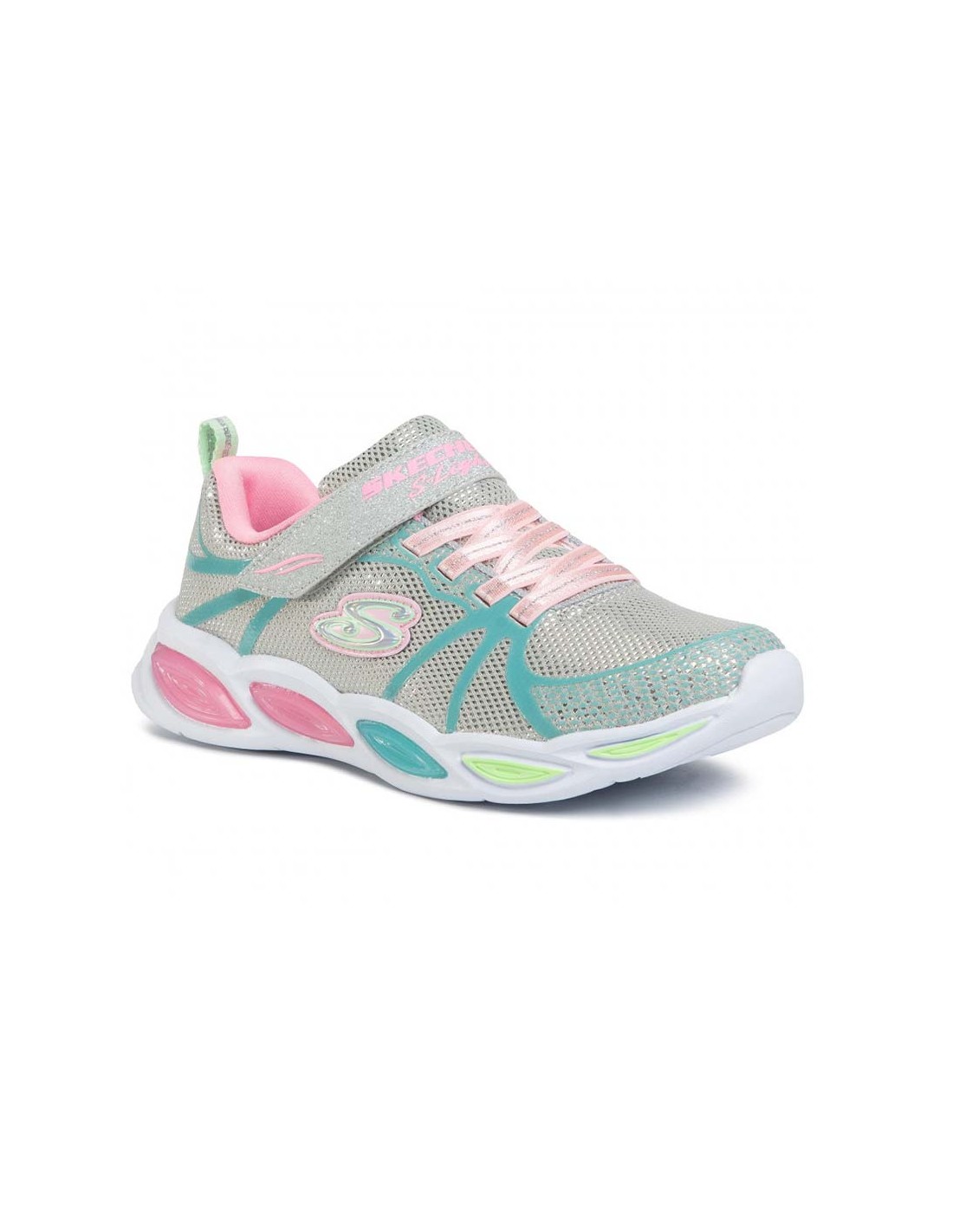 Le sneaker Skechers S Lights: Shimmer Beams - Sporty Glow hanno una tomaia sportiva in tessuto in mesh con finitura luccicante e applicazioni metallizzate. Sono slip-on con allacciatura elasticizzata e presentano un'intersuola con decorazioni luminose e colorate che lampeggiano con ogni passo.